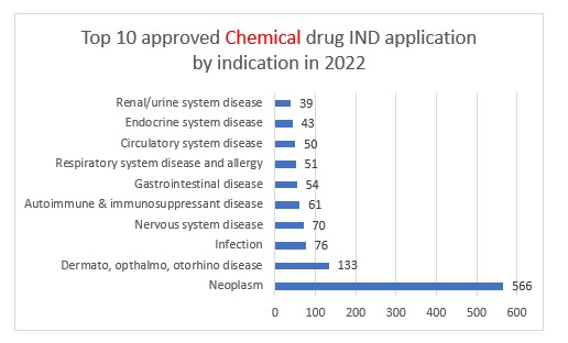 Approved applications for chemical INDs decreased slightly YoY by 3% from 1327 to 1286. Of the approvals that were granted over half were for the fields of neoplasm, dermatology, ophthalmology and otorhinolaryngology.