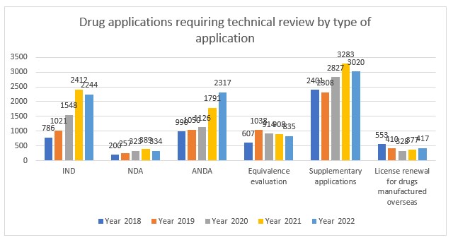 Applications for Investigational New Drugs (IND) decreased for the first time over the last 5 years, along with New Drug Applications (NDA), equivalence evaluations and supplemental applications. Increases were witnessed for Abbreviated New Drug Applications (ANDA) and license renewals for drugs manufactured overseas.