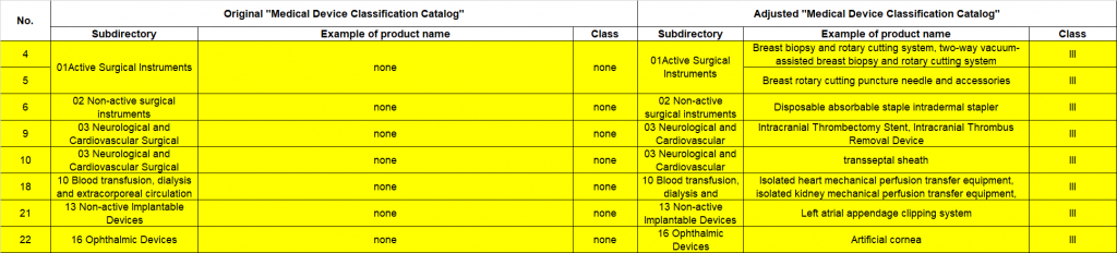 - Medical devices newly added to the classification catalogue (as highlighted in yellow in the following image).