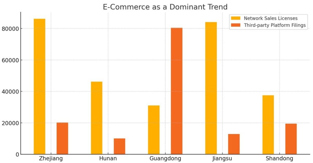 E-commerce continues to reshape the medical device industry in China. Zhejiang issued 86,205 network sales licenses and reported 20,169 third-party platform filings, highlighting its strong digital commerce ecosystem. Meanwhile, Hunan contributed significantly with 46,190 network sales licenses and 10,016 filings for third-party platforms.