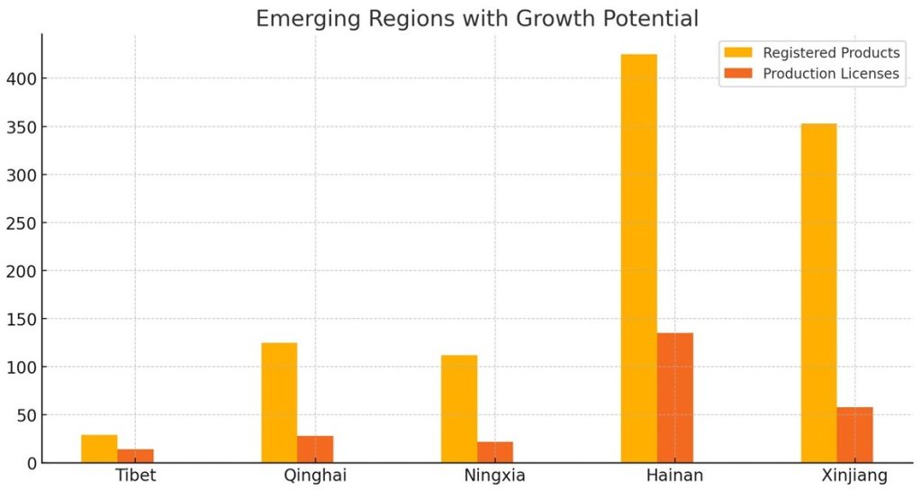 Smaller provinces such as Tibet, Qinghai, and Ningxia showed modest but notable figures in the dataset. Tibet recorded 29 product registrations and 14 production licenses, while Qinghai filed 125 product registrations and issued 28 production licenses. Ningxia added 112 product registrations and granted 22 production licenses.