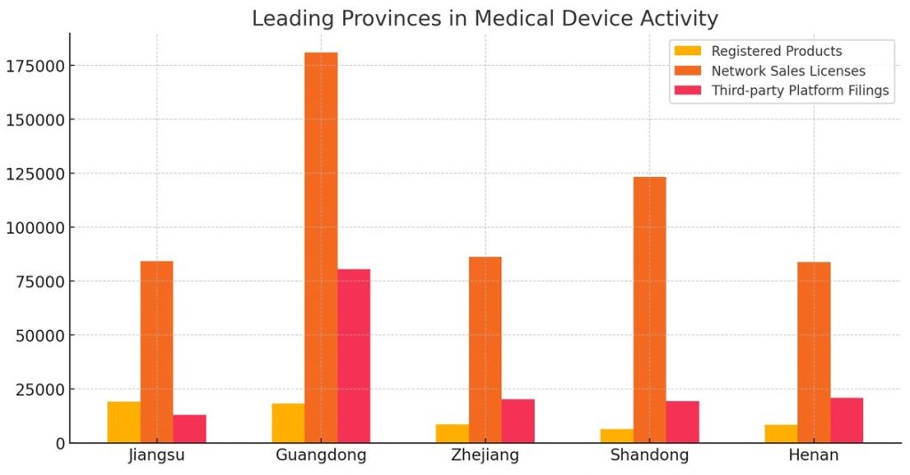 Several provinces continue to lead in medical device activity. Jiangsu reported 19,071 registered products and accounted for 84,124 network sales licenses. Similarly, Guangdong emerged as a leader in both production licensing, with 3,066 licenses, and third-party platform filings, which reached 180,846 records.