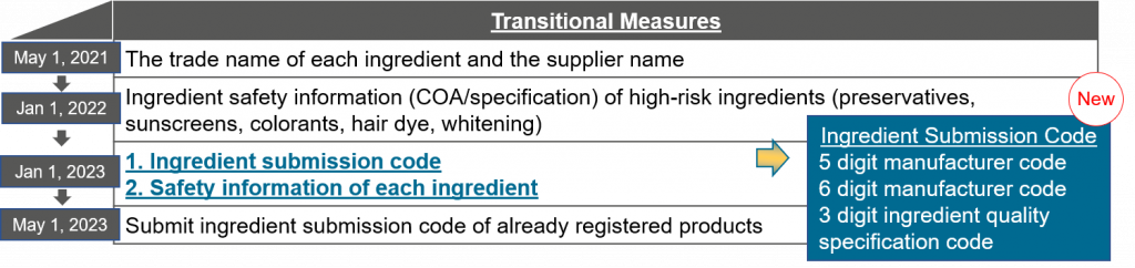After the raw material safety information from the supplier is submitted in Chinese through the online platform designated by the NMPA (National Medical Products Administration), the ingredient submission code will be generated. The submission of ingredient submission code will be mandatory from 2023, however, the online platform is yet to be announced for launch. Read our blog post on the CSAR related action timeline for further information.