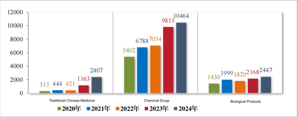 Among the 15,318 technical evaluation drug registration applications accepted in 2024, there were 2,407 traditional Chinese medicine applications, 10,464 chemical drug applications, and 2,447 biological product applications. For details on the acceptance of technical evaluation registration applications for each drug type from 2020 to 2024, see Figure 2.