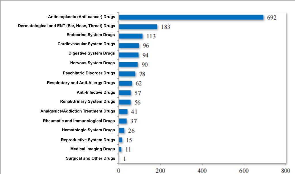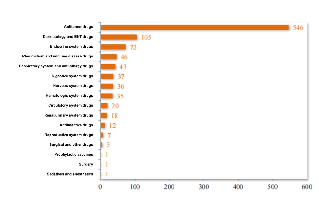 Among the 1,785 INDs, 1,345 were for innovative chemical drugs (568 varieties) and 440 for improved-type chemical drugs (237 varieties). Among the 255 NDAs, 57 were for innovative chemical drugs (38 varieties), 108 for improved-type chemical drugs (46 varieties), and 90 for Class 5.1 chemical drugs (57 varieties).