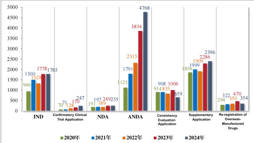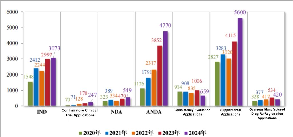 Figure 1 Acceptance of registration applications from 2020 to 2024, as reported in CDE’s 2024 Drug Review Report