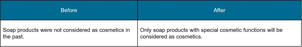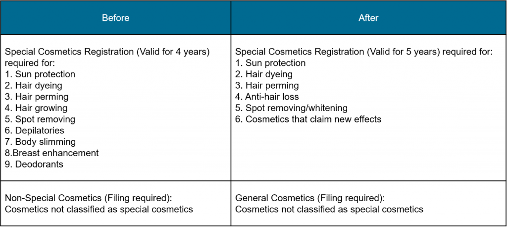 Note: Registered products with functions for hair growing, depilatories, breast enhancement, body slimming, and deodorants will no longer be classified as special cosmetics after a 5-year transition period.