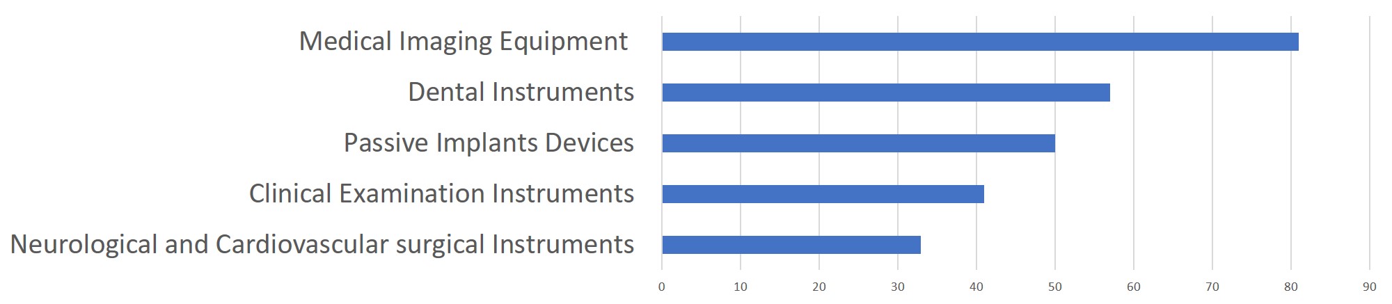 In 2019, the NMPA approved 1,726 new registrations in total.The provincial medical product administration (MPAs) authorities approved a total of 17,017 applications of China domestic Class II medical devices, an increase of 53.4% from 2018.The municipal medical product administration (MPAs) authorities handled a total of 16,754 filing applications of China domestic Class I medical devices, decreased by 2.4% as compared to 2018.China continues to focus on the supply of high-end, high-cost medical devices from abroad. The top five class II and III product groups of foreign origin to be registered in 2019 were:1. Medical Imaging Equipment (81 Registrations)2. Dental Instruments (57 Registrations)3. Passive Implants Devices (50 Registrations)4. Clinical Examination Instruments (41 Registrations)5. Neurological and Cardiovascular Surgical Instruments (33 Registrations)